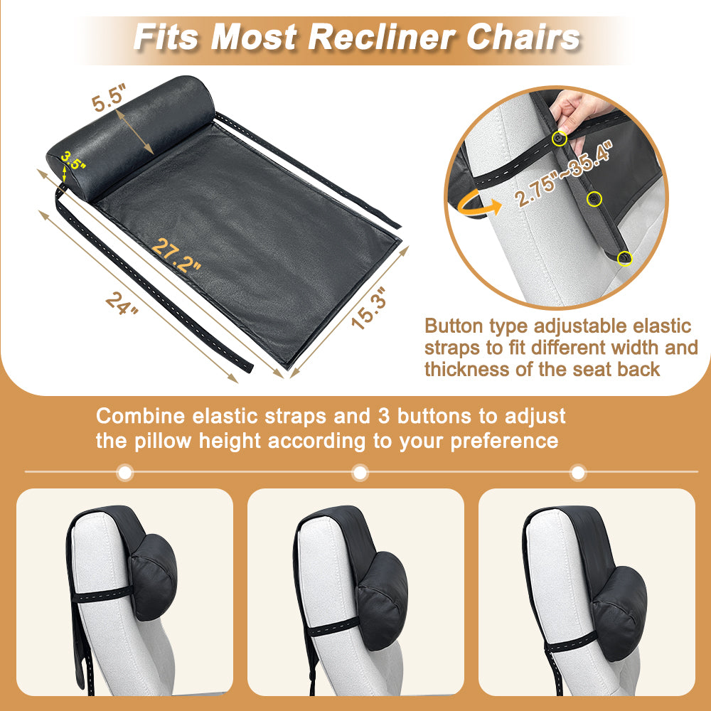 - 【Perfect Seat Accessory】Leather neck pillow designed with two elastic straps and three buttons of different heights. It can be secured according to the width of the chair and the desired height of the pillow. Therefore, it is suitable for all types of chairs, car seats, outdoor recliners, sofas, or office chairs.